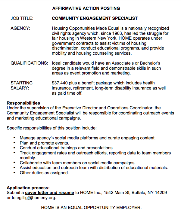 Please see the job description below. If you meet the qualifications and would like to apply, please send a resume and cover letter to egillig@homeny.org or to HOME, Inc., 1542 Main St, Buffalo, NY 14209. Download the description in PDF form here.
